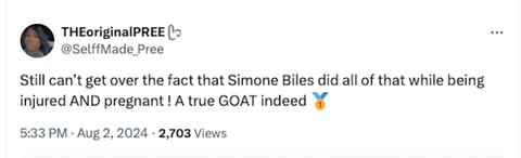 Therefore, any claim about Biles being "heavily pregnant" in 2024 is chronologically impossible and factually incorrect. She gave birth to her first child less than a year prior.
